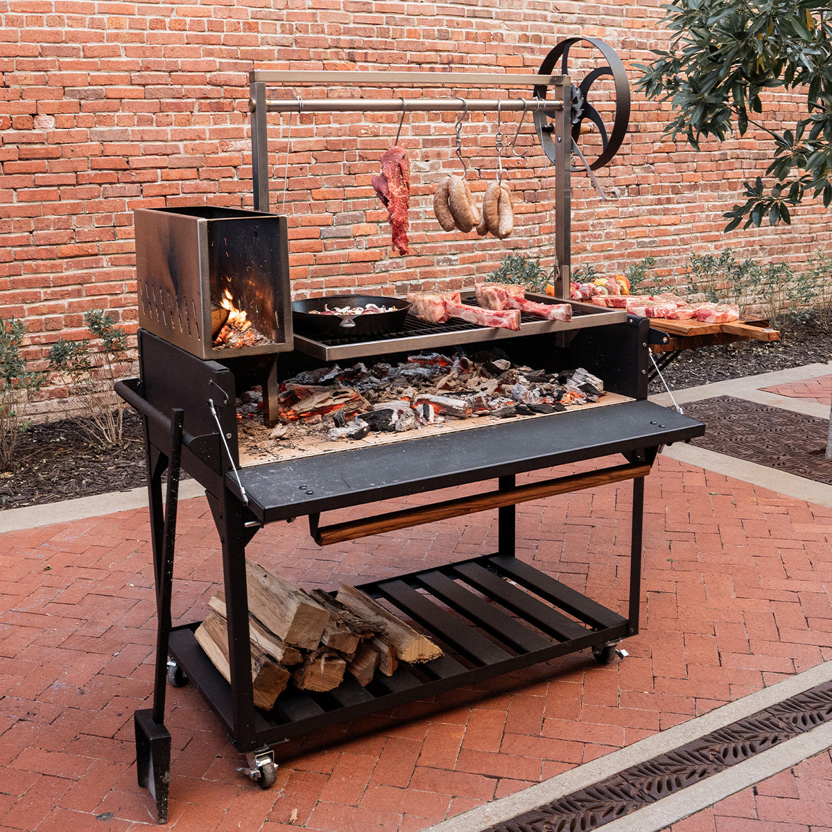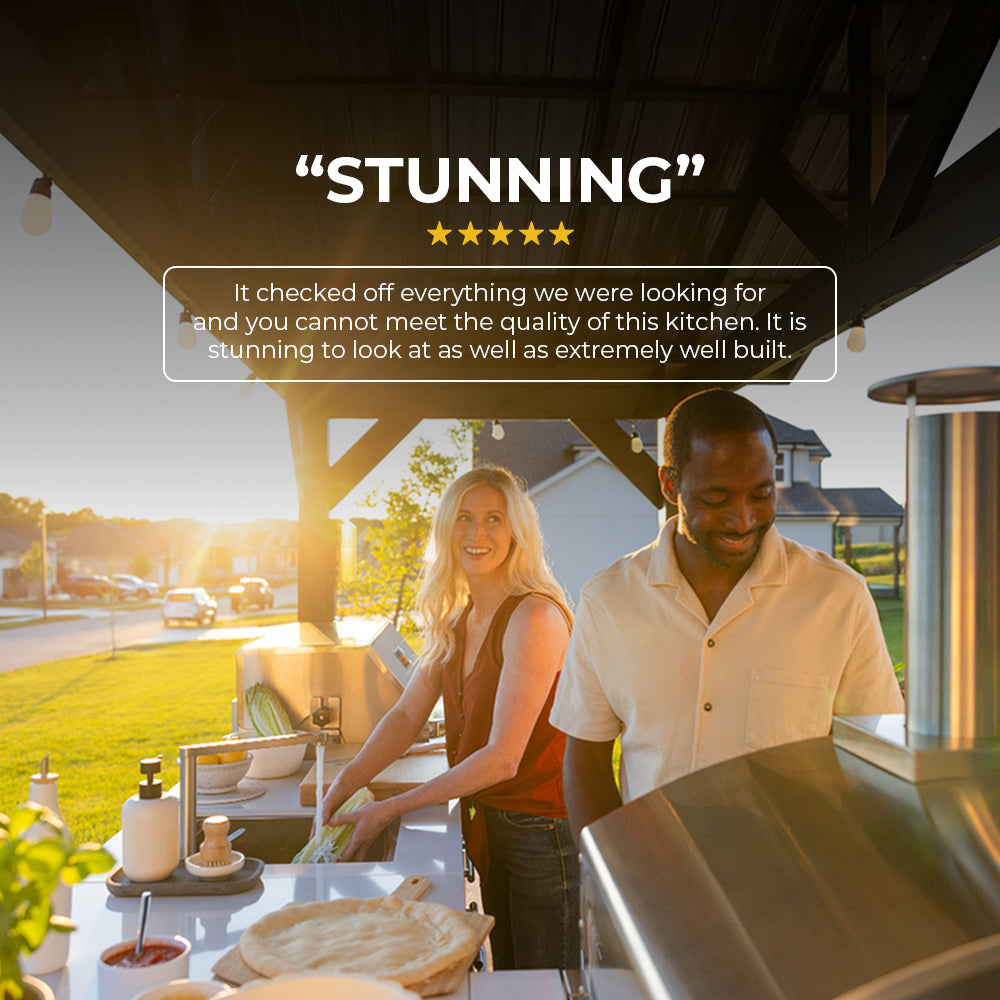 DIY outdoor kitchen with modern design featuring a grill, pizza oven, fridge, and all-weather construction.