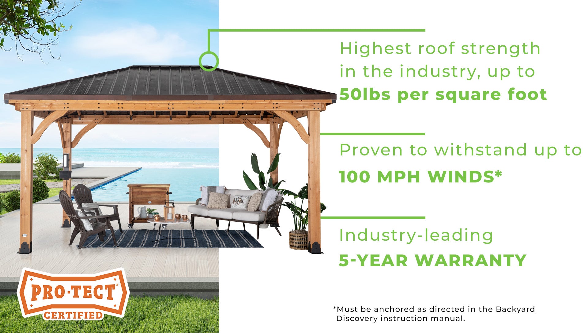 Solid engineering and industry leading strength make our gazebos durable and weatherproof. Tested to withstand up to 10,100 pounds or up to 30 inches of snow load and winds up to 100 mph when anchored as directed, your gazebo will last for years to come.