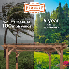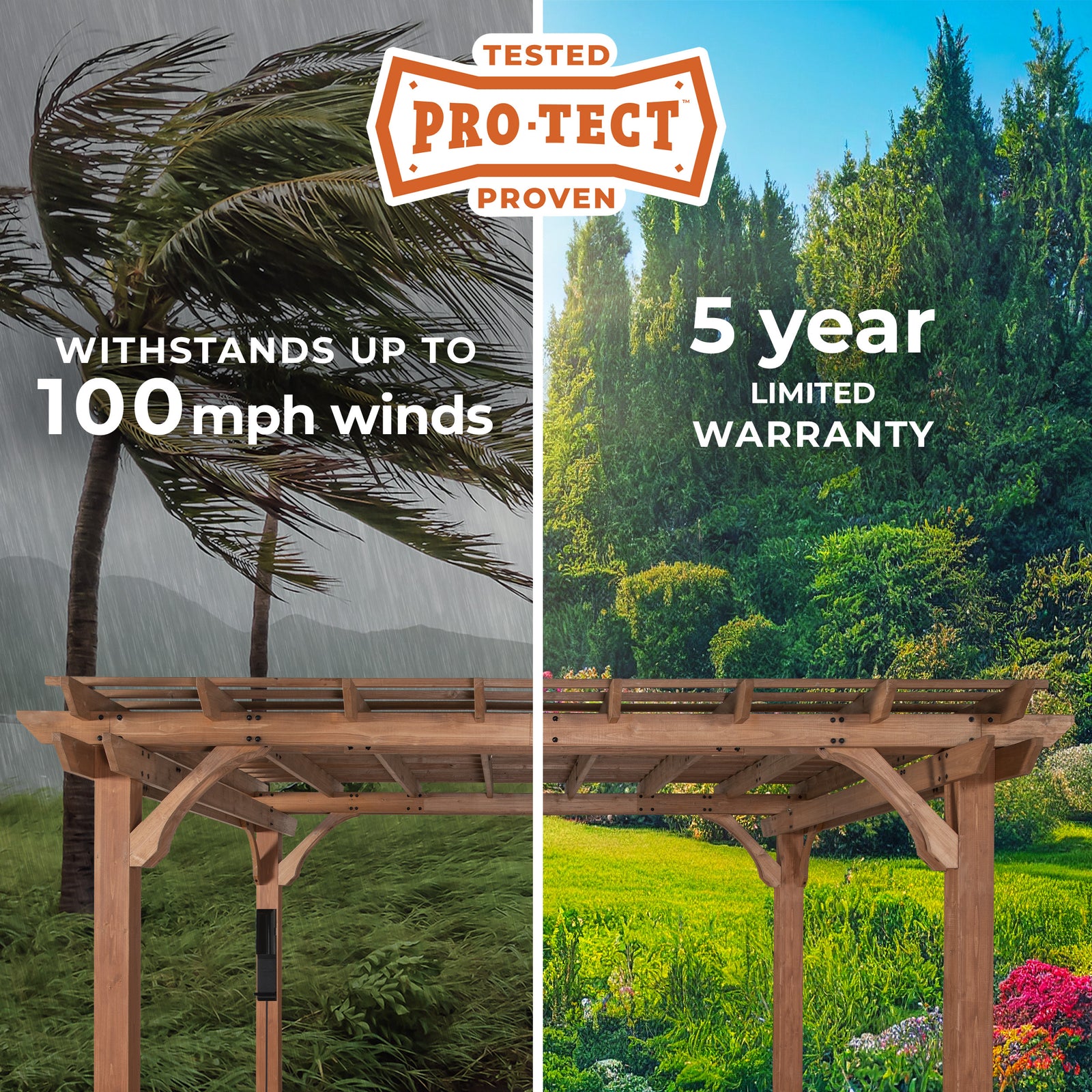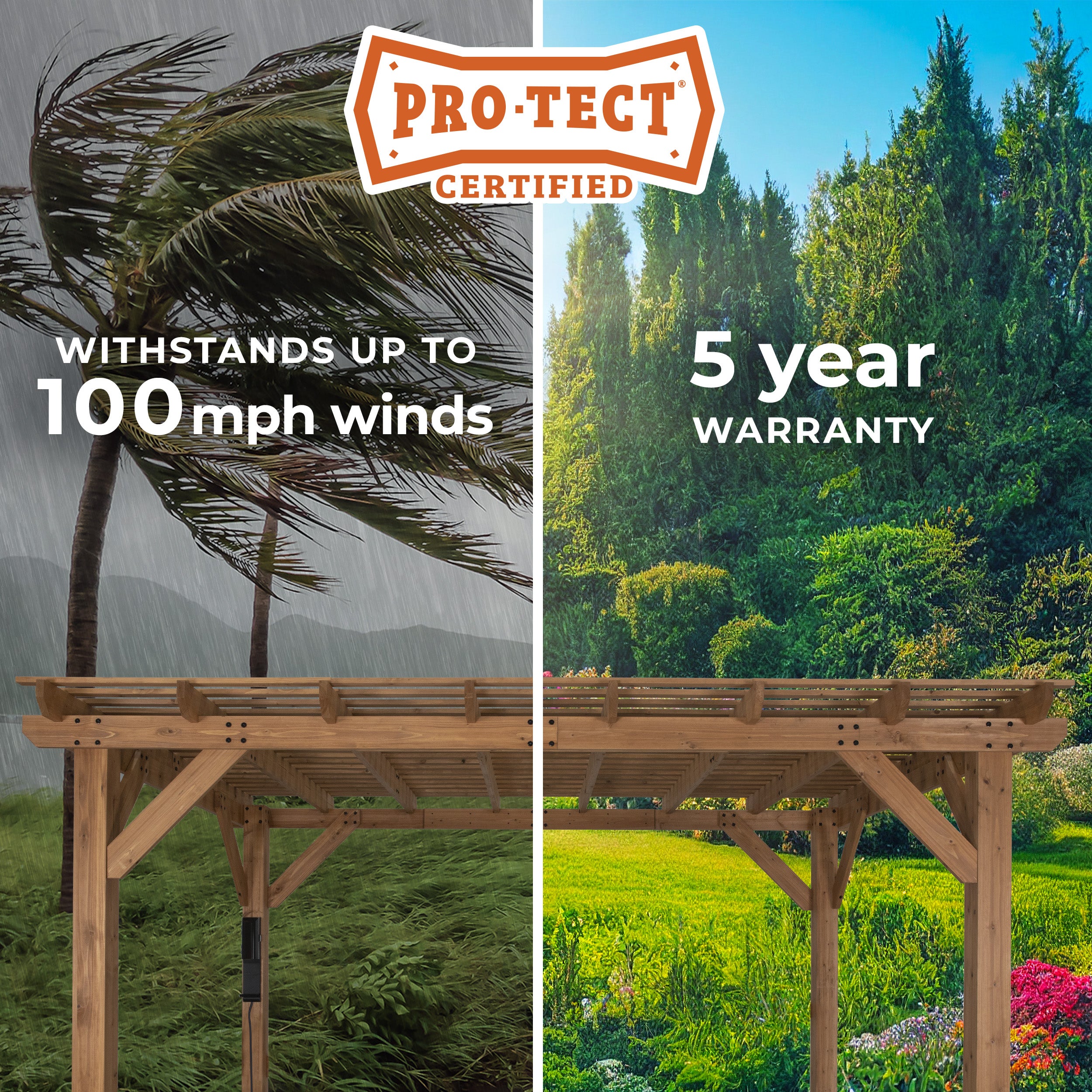 Our pergolas are tested to withstand wind up to 100 mph when anchored as directed. That means you can trust your pergola will be safe and secure in hurricane-force winds.