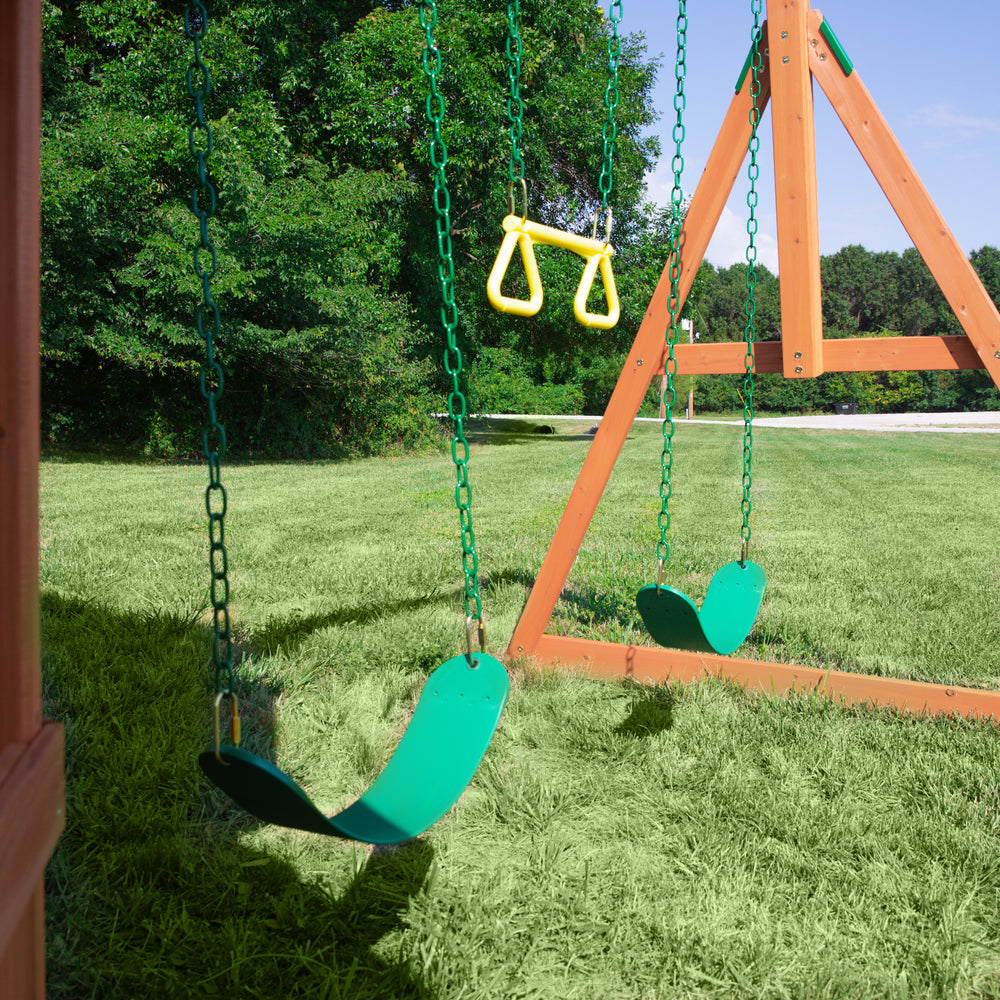 Double the fun with 2 belt swings and a trapeze so 3 kids can swing at once.