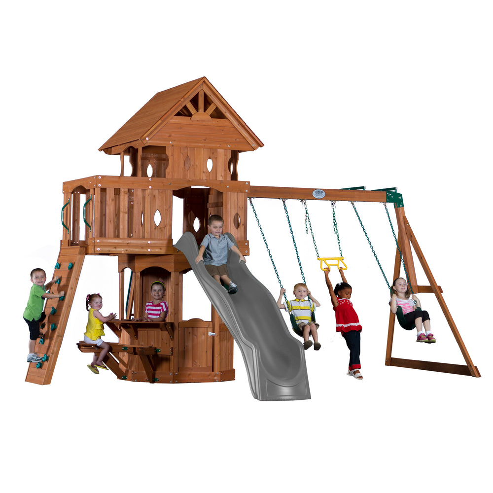 Our wooden swing sets offer a wide range of sizes, features, and styles that will turn any backyard into a playground.
