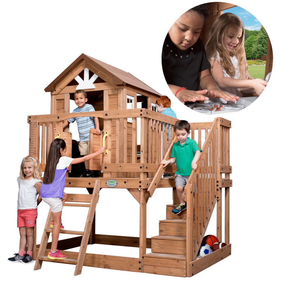 • Elevated Adventure: Raised clubhouse with saloon doors, windows, and wrap-around deck for backyard adventures
