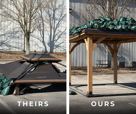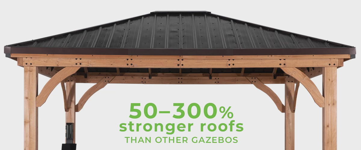 - The stronger tensile strength of steel is why you don’t need to worry about clearing the roof of snow on our gazebos. They’re more than strong enough to hold that weight until the snow melts or slides off on its own. (Our strongest gazebo can hold up to 12,600 lbs.)