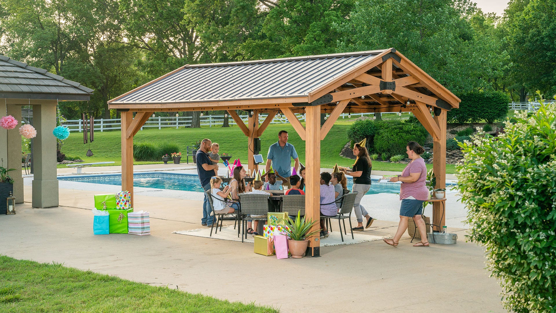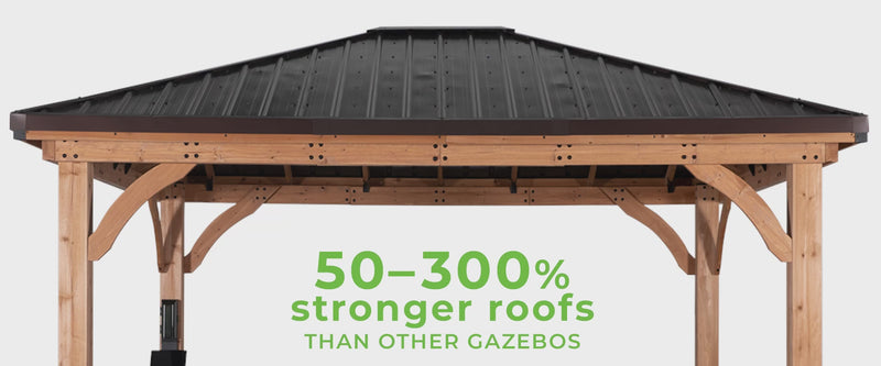 We’re so happy we purchased this particular cedar gazebo. It is beautiful and sturdy. We chose this one for its durability and the ability of the steel roof to handle snow accumulation.
