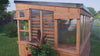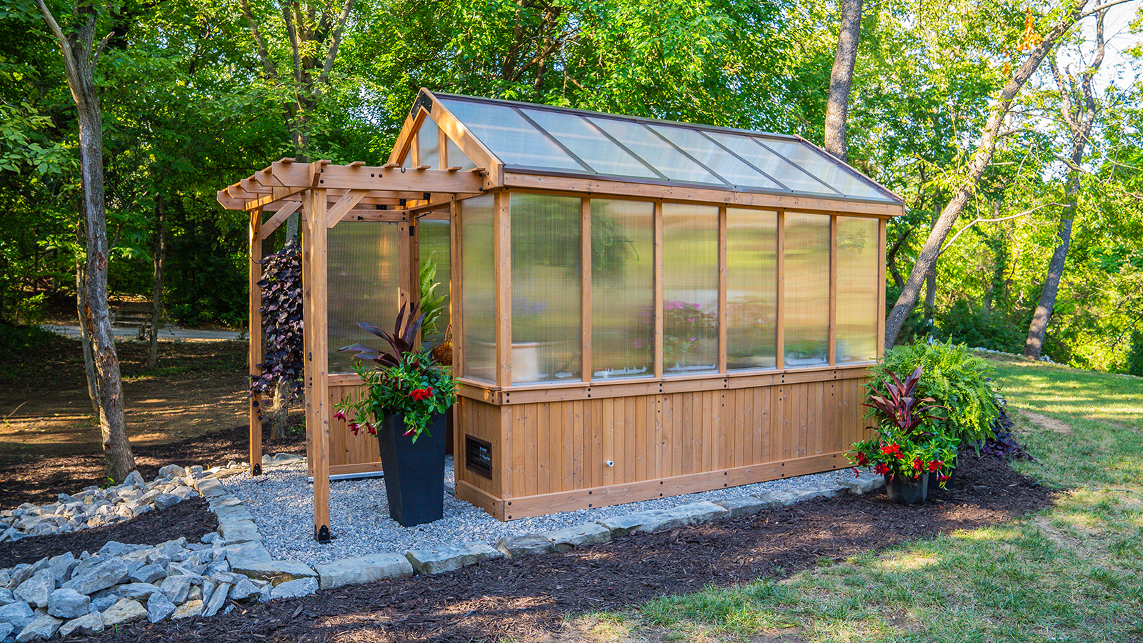 Modern cedar and polycarbonate greenhouse with pergola overhangs for elevated style.