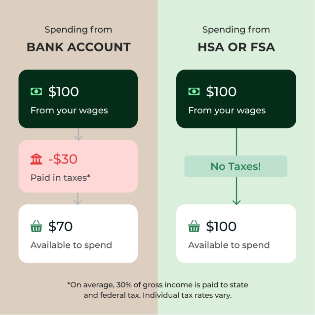 Because HSA/FSAs use pre-tax money, you’re getting more purchasing power for your dollars. Rather than pay taxes on income and then spend it on health items, qualified customers can use pre-tax funds to invest in root cause interventions.