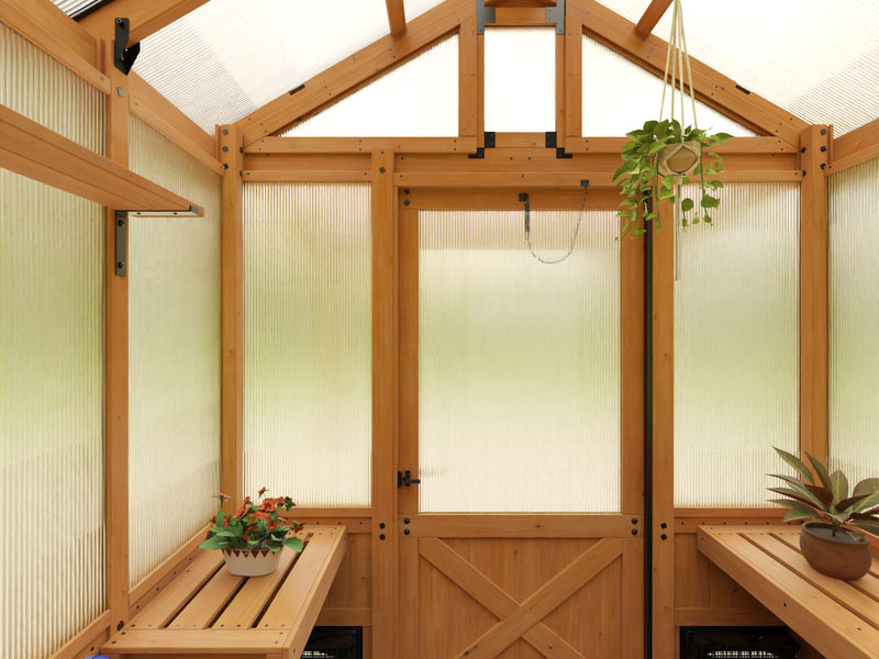 With cedar wood, a strong roof, our patented PowerPort™, and an array of useful features, this greenhouse combines the best materials with thoughtful design.