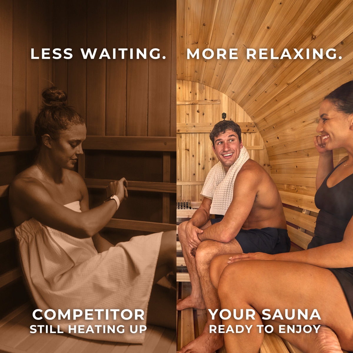 The Henley Cabin Sauna is built for traditional steam or dry heat, featuring our powerful PrairieFire™ 9kW heater that warms up 50% faster than typical 6kW saunas.