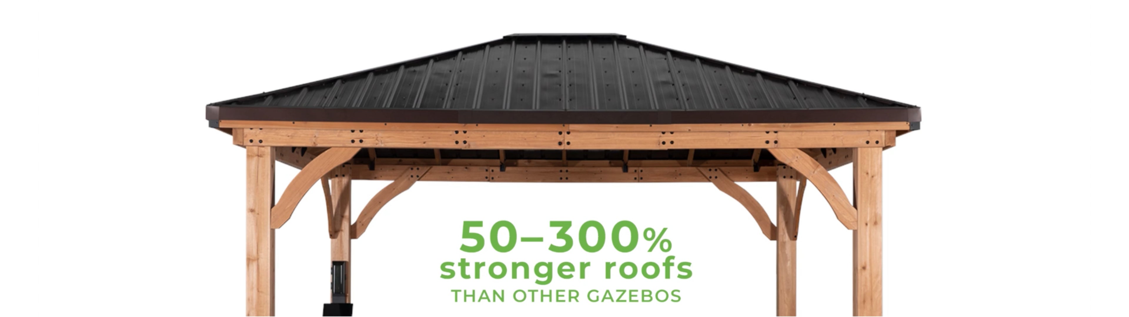 Our heavy duty 29 gauge steel roofs are tested to withstand heavy snow loads up to 30 inches and exceed industry standards making them the strongest gazebo for long term durability and enjoyment.
