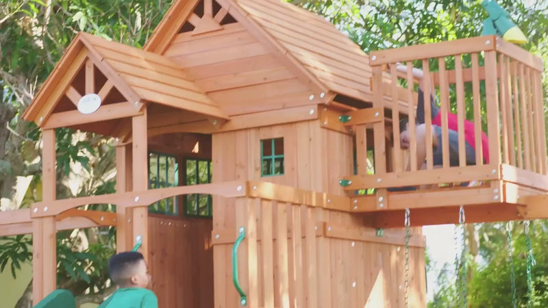 • Elevated Adventure: Spacious raised clubhouse with a wooden roof, balcony, covered entryway, and bay windows is perfect for outdoor play
